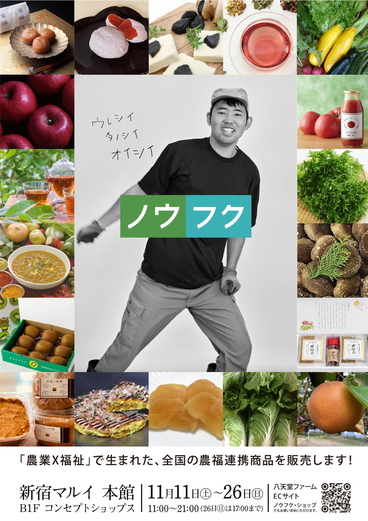 新宿マルイ本館地下1階 concept shopsで期間限定ノウフク・ショップがオープンします。農業と福祉の連携から生まれたノウフク商品約130点を、目利きバイヤーが全国からセレクト!ここでしか買えないノウフクとっておきの商品が集結します。イベントと同期間、八天堂ファームプロデュースのECサイトも開設されます!