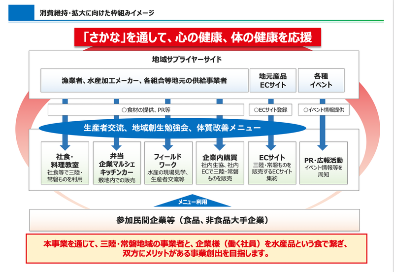 企業等へ社食や弁当、キッチンカーやマルシェを通して三陸・常磐地域の水産品を活用したメニューや商品をお届けすることで消費拡大に繋げ、三陸常磐フェアといったイベント等も企画することで、三陸・常磐地域の水産業等の持続的な発展を目指します。