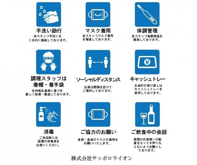 また、お客様にご安心してご利用いただけるよう、店内の消毒や従業員のマスク着用・手洗い、出勤時の検温等を徹底し営業します。お客様には手指消毒のお願いなどでご不便をおかけしますが、何卒ご理解頂けますようお願いいたします。