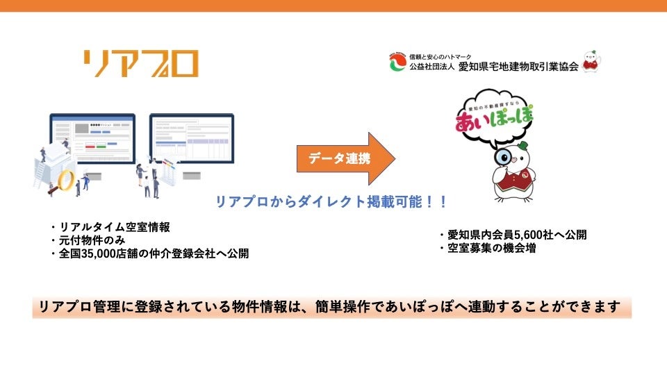 不動産業者間流通の「リアプロ」が、愛知県宅地建物取引業協会の「あいぽっぽ」に空室データ連携を開始。