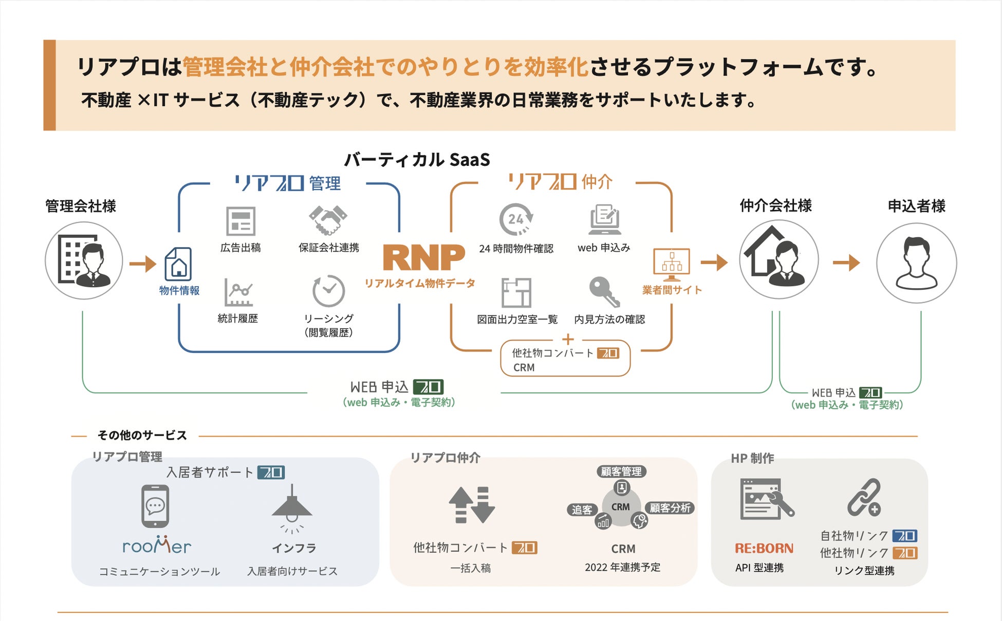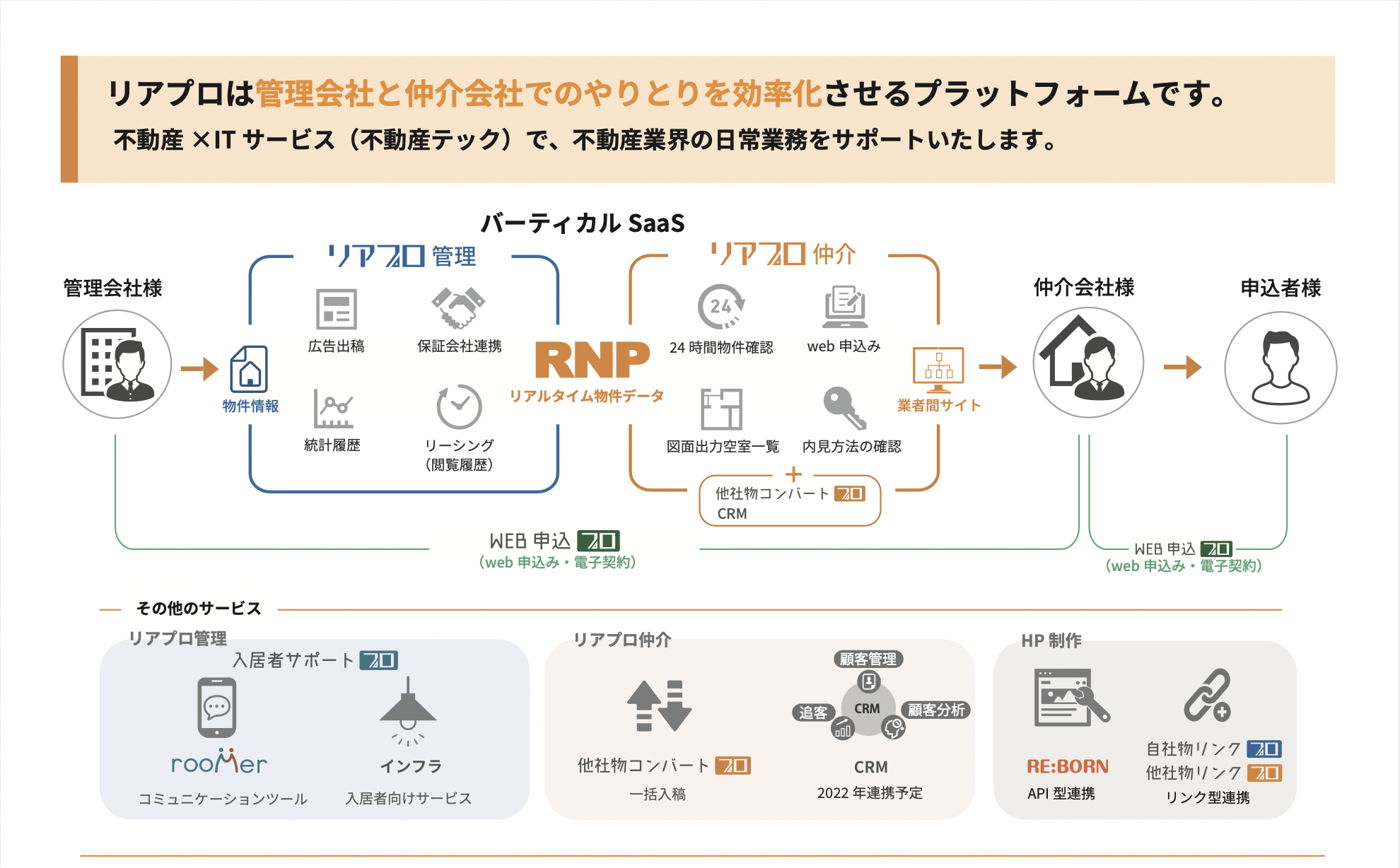 事業内容 : 業者間流通サイト「リアプロ」を中心に、賃貸管理業務・賃貸仲介業務のDXを推進。