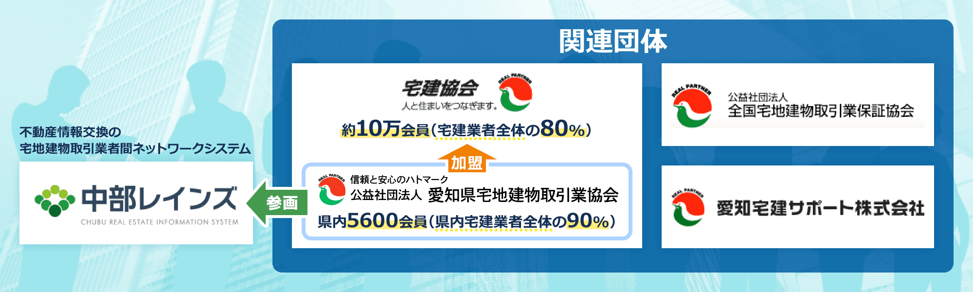 愛知県宅建協会には、宅建業法第64条に基づく公益社団法人全国宅地建物取引業保証協会・愛知本部をはじめ、会員の事業活動を強力にサポートする愛知宅建サポート株式会社などの関連組織があります。