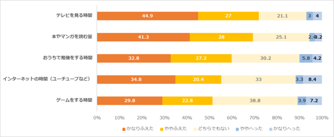 ■コロナ前後での生活変化…読書やテレビ視聴の時間増加は約7割、ネットやゲームは約5割が増加。自宅学習の時間も約6割が増加。