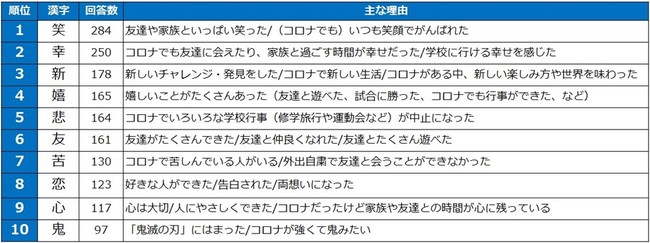 トップ3すべてがポジティブな漢字です。コロナで生活が大きく変化する中でも、それを新しい経験として、楽しみや幸せを見つけながら、家族や友達と充実の日々を送っていたことがうかがえます。