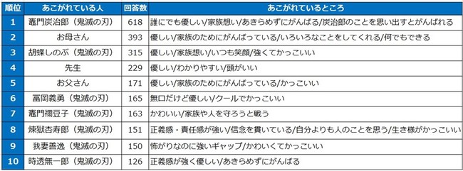 1位の「炭治郎」は「あきらめずにがんばる」姿勢に憧れるという声も多くありました。「鬼滅の刃」の登場人物は、7人がトップ10入りしており、全体でも多くの回答(2007票)がありました。