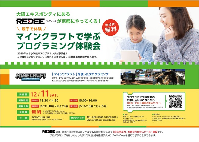 日本最大級のデジタル教育施設「REDEE(レディー)」が、12月、出張プログラミング体験会を京都で開催。6組の小学生・中学生が「マインクラフト」プログラミングを体験。